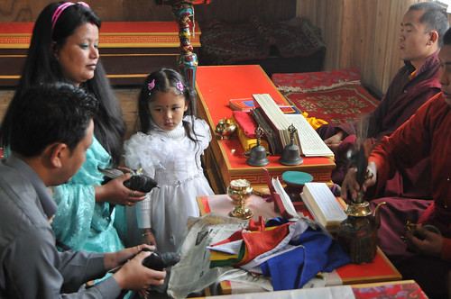 Salimos del recinto monástico y oímos unos cantos que seguimos; de esta manera damos con un monasterio pequeño, nuevo y poco importante. No está en las guías y no parece tener interés, pero hoy están haciendo una ceremonia de bendición de banderolas budistas. Una pareja con una niña y los abuelos han ido a que les bendigan una ristra de esas banderitas. Y así la sorpresa te surge en cualquier sitio. Hemos estado mucho rato allí viendo las extrañas maniobras y rituales de los dos monjes (no hay más en ese monasterio). Porque si hay una religión con ritos raros es el budismo tibetano. Al final uno de los dos monjes me ha dado un par de manzanas. La pena es que me he olvidado de preguntar si había que rezar algo antes de comerlas como ocurre en la religión católica con las galletas y similares que se bendicen el día de San Blas y que tan bien parecen ir para los problemas de garganta. Sí les he preguntado por su procedencia (de los monjes, no de las manzanas, que por su mal aspecto debían ser de la zona, las manzanas, no los monjes): uno era gurum y el otro nepalí aunque siempre la lengua vehicular religiosa es el tibetano.