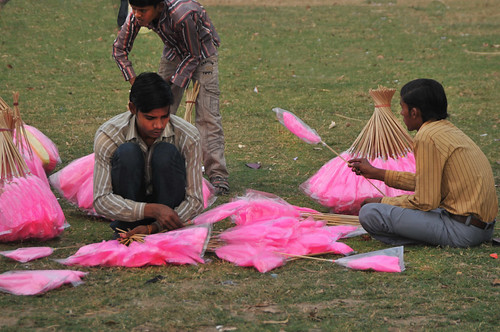 Vemos a los vendedores de algodón de azúcar. Lo llevan en bolsas de plástico y se distribuyen la mercancía sentados en la hierba.